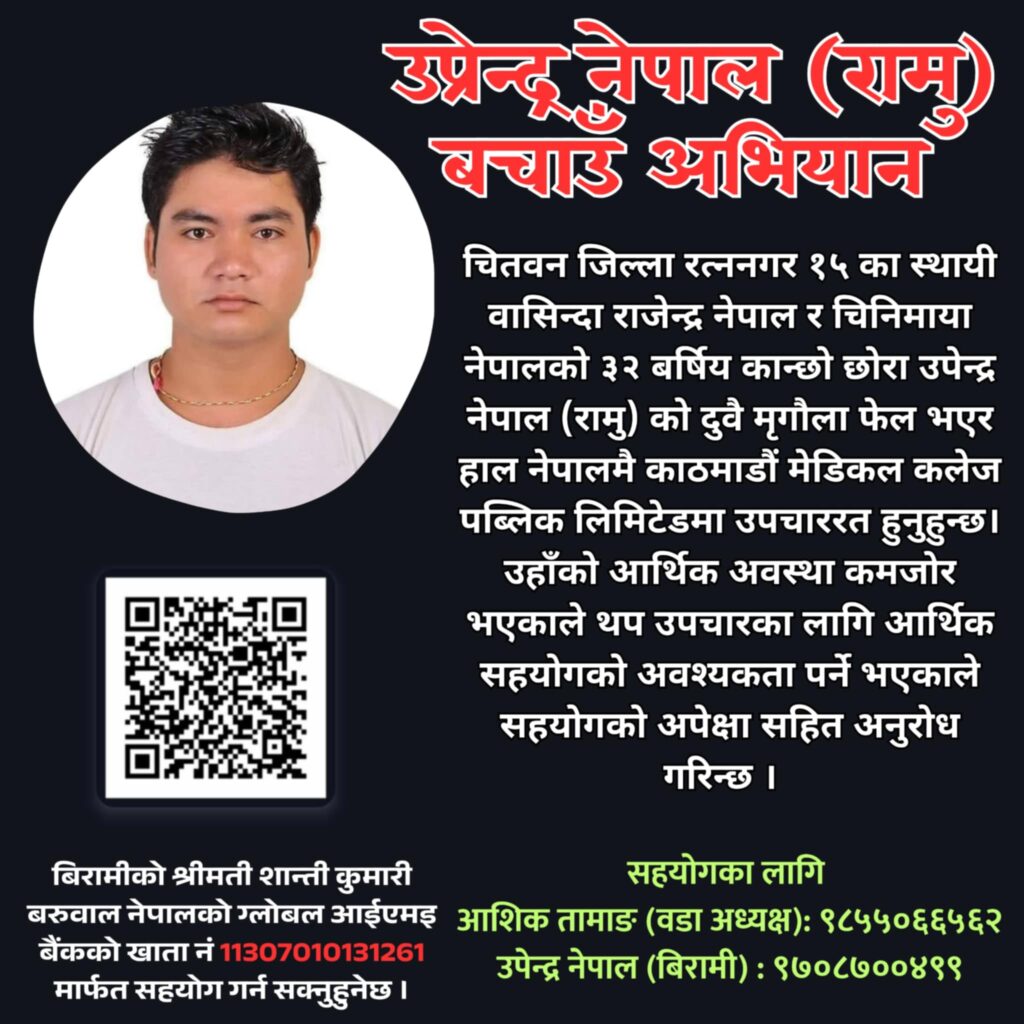 रत्ननगर, बैशाख १५ । रत्ननगर वडा नम्बर १५ का स्थायी बासिन्दा ३२ वर्षीय उपेन्द्र नेपाल (रामु) को दुवै मृगौला फेल भएको छ । राजेन्द्र नेपाल र चिनिमाया नेपालका कान्छा छोरा उपेन्द्रको दुवै मृगौला फेल भएपछि उनको परिवार गहिरो पीडामा डुबेको छ। काठमाडौं मेडिकल कलेजमा उपचाररत उपेन्द्रको जिवन अब आर्थिक सहयोगको आशामा अडिएको छ ।