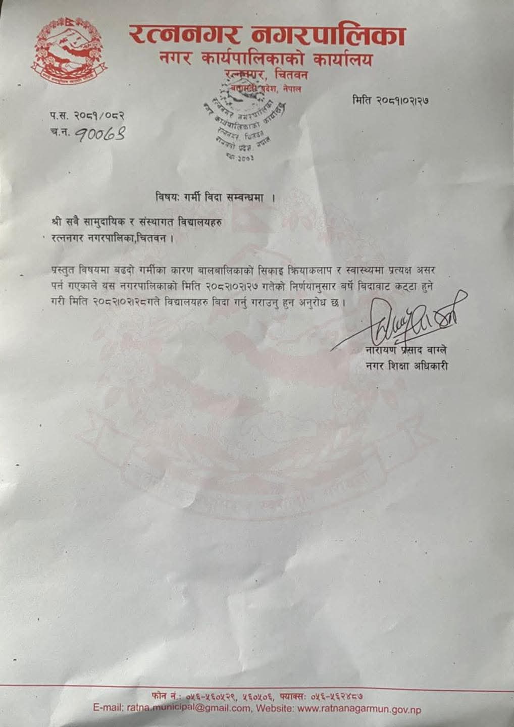 रत्ननगर, जेठ २७ । रत्ननगर नगरपालिकाले बढ्दो गर्मीका कारण बालबालिकाको स्वास्थ्य र सिकाइमा परेको असरलाई मध्यनजर गर्दै भोली (बुधवार) एक दिन नगरपालिका भित्रका सम्पूर्ण सामुदायिक र संस्थागत विद्यालयहरूमा बिदाकाे घोषणा गरेको छ।