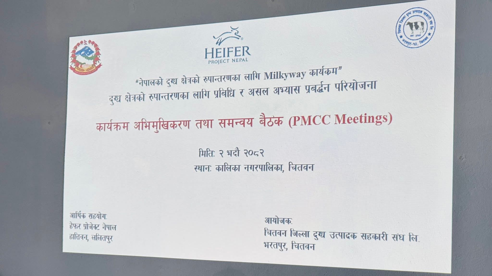 चितवन जिल्ला दुग्ध उत्पादक सहकारी संघ लि. भरतपुरको आयोजनामा तथा हेफर प्रोजेक्ट नेपाल, हात्तिवन ललितपुरको आर्थिक सहयोगमा नगरपालिकाकाे कार्यालयमा अभिमुखिकरण तथा समन्वय बैठक गरेकाे हाे ।