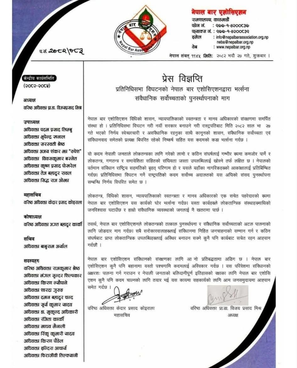प्रतिनिधिसभा विघटन गरिनु सर्वोच्च अदालतको यसअघिको संसद पुनस्थापना सम्बन्धी निर्णय विपरित हुने उल्लेख गर्दै बारले कुनै पनि बहानामा पश्चगामी कदमलाई अस्वीकार गर्ने बताएको छ ।